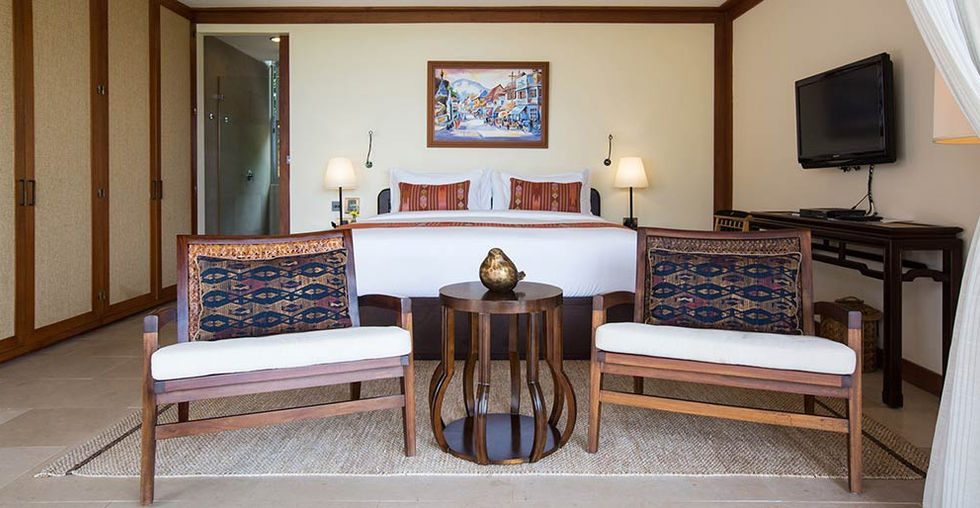 At one end, a spacious, comfortable lounge is dominated by a long L-shaped cream sofa and armchairs, set around a coffee table of natural sandstone. Light wood consoles and Thai lamps and artefacts create an inviting place for social gatherings – complete with a large flat-screen Smart TV. An impressive pedestal dining table is like a piece of art in the centre, serviced by a state-of-the-art show kitchen with island bar and branded appliances including a built-in wine cooler.